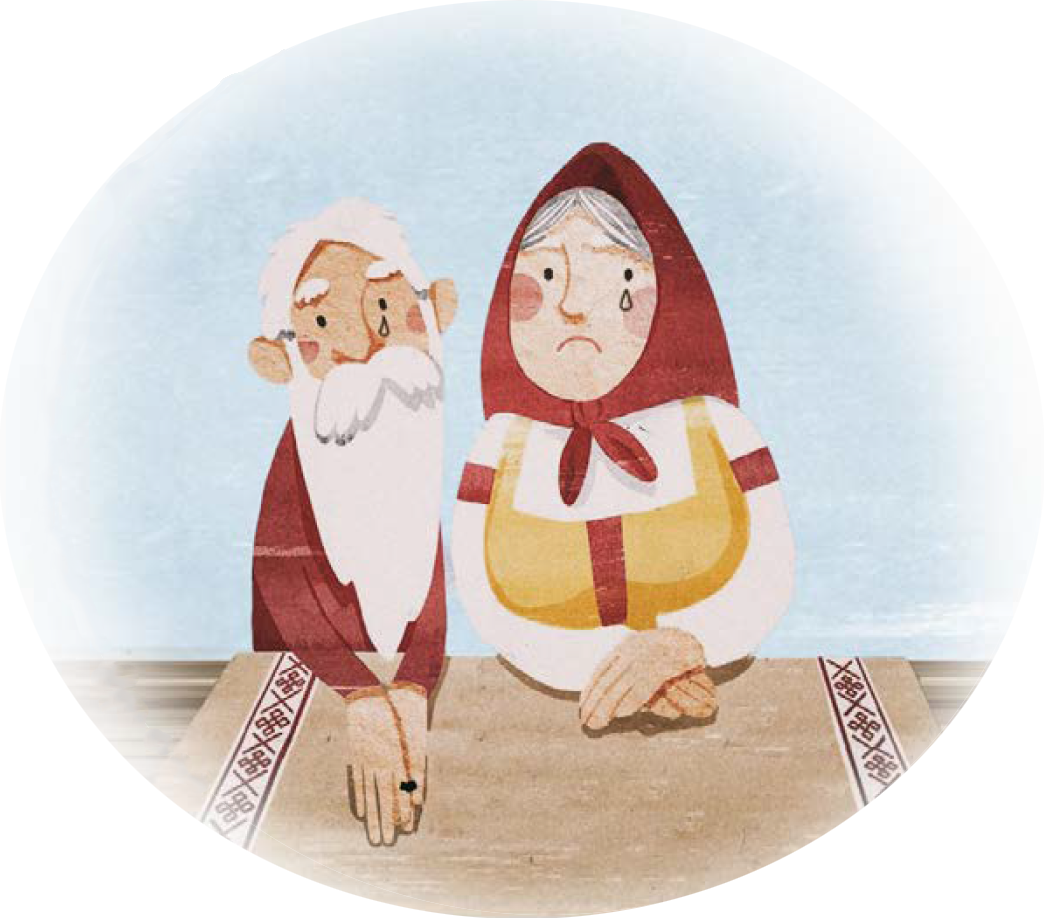 Старик говорит: «Вот так и так, наша курочка рябушечка снесла яичко, пестро востро костяно мудрено. Положила старуха яичко на полку, мышка бежала, хвостиком вильнула, полку свернула, яичко скатилось, об пол разбилось; я старик плачу, старуха рыдает, курочка кудахчет, огонь в печи пылает, двери скрыпят, сор под порогом вскружился, тын покосился, ворота хлопают, щепы в поле летят!». Как услыхали соседи про стариково горе, так развели руками и ну вопить на все село. Сбежалось село: «Что, что?».