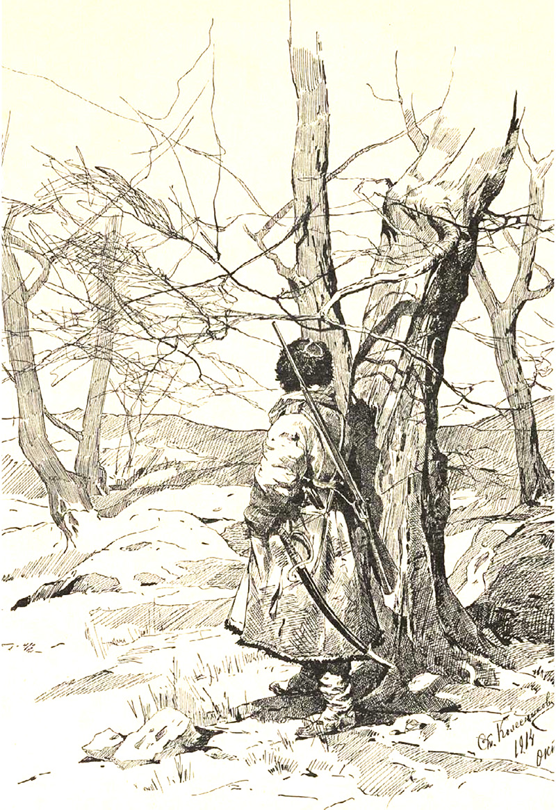 «Господи, если хочешь, то да мимо идет меня чаша эта; но да будет воля твоя, а не моя. Молод я и чашу смерти испить не хочется; но да будет воля твоя, а не моя. А коли Спасов день присудил мне от сует мирских спасения, то прими благостыней своей душу мою, подай силу и крепость мне и мужество, и победу пошли государю моему – во веки веком, аминь». И пробудилась в Спасов день, раным-рано, молва, говор шумный по стану русскому: скоро читает молитву свою солдат русский, скоро снаряжается и одевается, а на битву с неприятелем готов во всякое время, во всякий час: в суме патрон, на ружье погон, да коли примкнуть штык, – и Господь по нас! И построились полки, под ружье стали. <…>