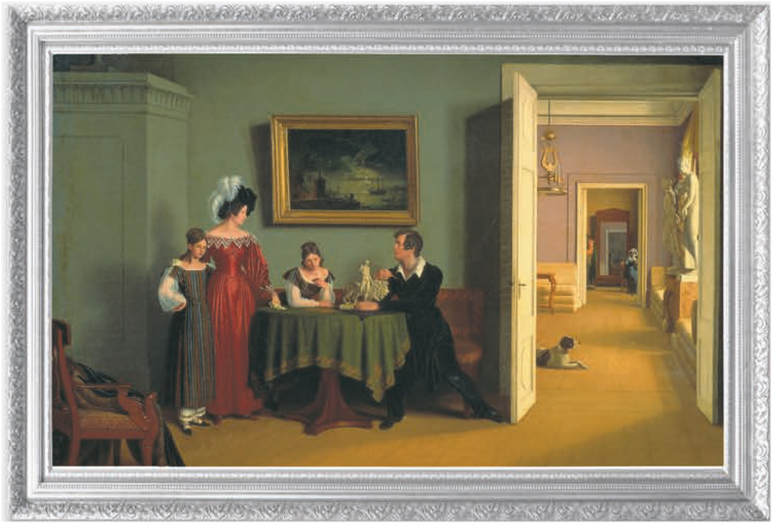 Больших картин у Толстого было не очень много. Он с удовольствием писал интерьеры дворянских домов. А на самой знаменитой своей картине художник изобразил светлую уютную комнату в своем доме и себя в окружении семьи. На стене висит картина другого русского художника – Сильвестра Щедрина, Толстым почитаемого. И совершенно очевидно, что это добрая семья, где все любят друг друга: лица у детей и у взрослых спокойные и умиротворенные.