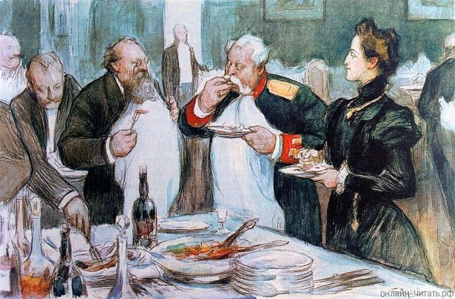 – Для ихнего сыру... рябчиков тертых,– печенков, на коньяке. Заячий пирог... да без зайца обойдусь: паштет из рябчишной требухи – не отличишь. Хотите – сами по моему леестру, а то я в Охотный могу?.. Сами. Только полная чтобы воля мне, подручных и медную посуду, очистить кухню... окромя положенного, две бутылки рябиновки. После обеда зачинаю! – И, мотнув головой, уходит.