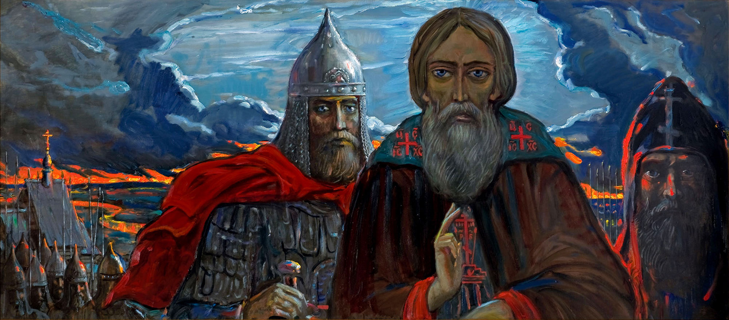 Узнав о приближении Мамая, князь Дмитрий принял решение немедленно выступить против врага. Для того чтобы бросить вызов хану, необходимо было накопить силы и вывести против него объединенное общерусское войско. Он разослал своих гонцов по всем княжествам: «Присылайте войска!» Никто не прислал – хотели отсидеться, посмотреть, как дело пойдет… Дмитрий увидел, что его все предали, и он может рассчитывать только на свое московское войско. И вот в этой ситуации князь нашел единственно правильный выход: он стал собирать ополчение – простых людей, которые никогда на войну не ходили. Чтобы их поднять, нужно бы- ло объявить войну священной, и сделать это мог известный, уважаемый всеми человек, которому верили. И вот 16 августа 1380 года князь Дмитрий отправился в Троицкий монастырь попросить благословения у игумена Сергия Радонежского. Преподобный сказал: «Я даю тебе свое благословение, и ты увидишь его». И тут подошли два монаха, Пересвет и Ослябя, которые отправились вместе с Дмитрием Донским на Куликовскую битву. Это было мудрое решение преподобного, так как все знали этих людей, и все знали, что монах может покинуть монастырь и пойти на войну только при благословении игумена. Пересвет и Ослябя везде ездили рядом с князем Дмитрием, и народ понимал, что их благословил преподобный Сергий на священную войну. На этот призыв откликнулись даже из тех политических объединений, которые не хотели поддерживать Москву. Согласно ряду свидетельств, никогда еще Русь не выводила на поле битвы силы такого масштаба.