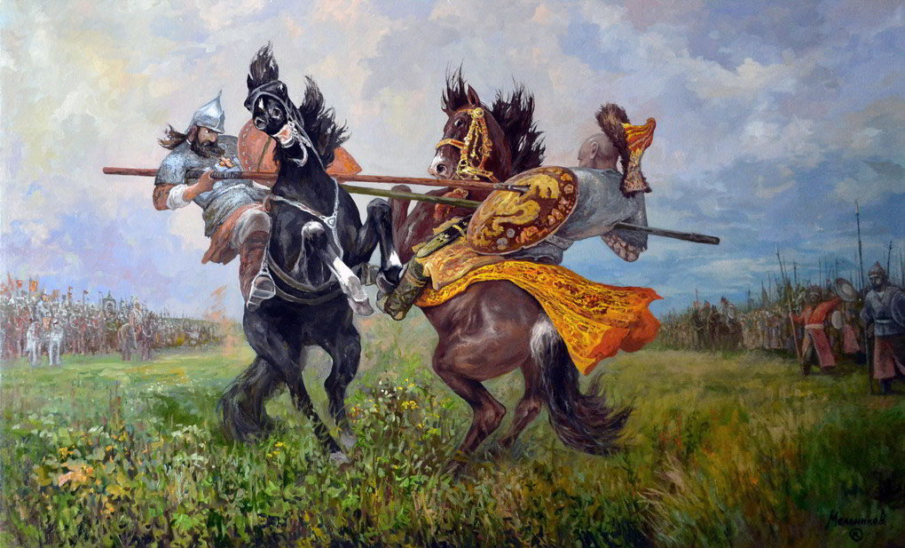 Хорошо знакомый со школьной скамьи исторический эпизод: Александр Пересвет, выходит на поединок с могучим богатырем Челубеем из стана Мамая. В сражении оба падают замертво... Легендарные подвиги Александра Пересвета, Дмитрия Донского и других русских воинов были описаны в «Сказании о Мамаевом побоище» (XV век).