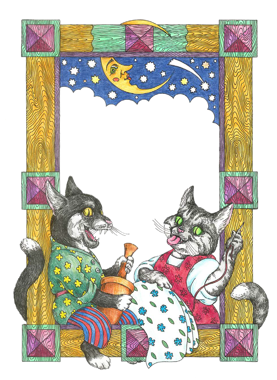 Медведь на работе каменья воротит, Рак на колоде рубашки колотит, Волки в болоте просо молотят, Кот на печи сухари толчет, Кошка в окошке ширинку шьет; Петька петух по лавкам пошел,