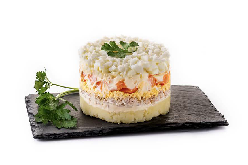 Основная идея этого салата состоит в том, что все ингредиенты в нарезанном виде выкладываются полосками на застеленную салатными листьями тарелку, но 5. Этот салат родом из СССР. Чаще всего его готовят из рыбных консервов, репчатого лука, сыра, вареных яиц, майонеза. Все ингредиенты измельчают и укладывают слоями, а верхний слой неизменно украшают крошкой из яичных желтков. Узнали?