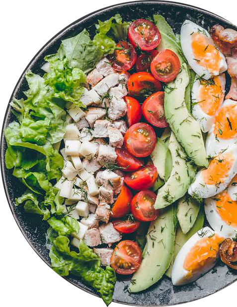 Основная идея этого салата состоит в том, что все ингредиенты в нарезанном виде выкладываются полосками на застеленную салатными листьями тарелку, но не перемешиваются. Продукты могут быть разными, но стандартный набор таков: яйцо, авокадо, помидоры, курица, лук, бекон, сыр с плесенью.