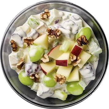2. Классический американский рецепт состоит из кисло-сладких яблок, нарезанных тонкой соломкой стеблей сельдерея и грецких орехов, заправляют его майонезом или лимонным соком с кайенским перцем.