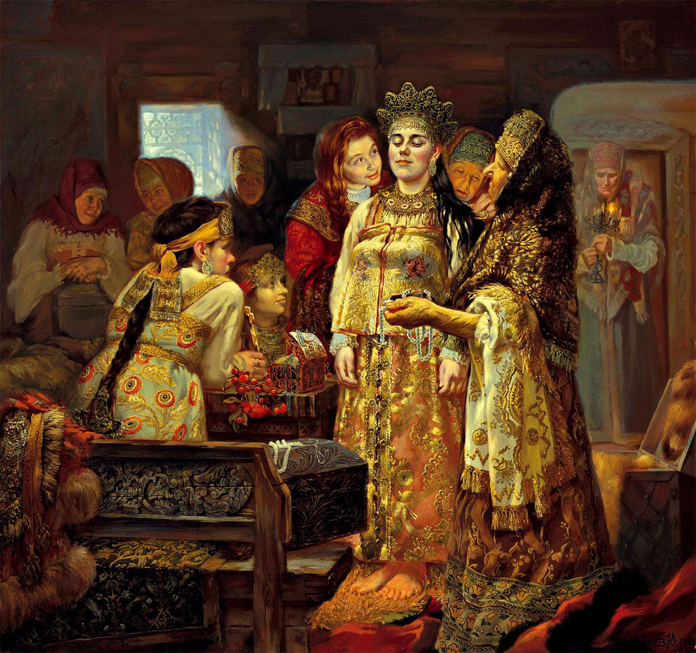 Когда царю и царевне чесали волосы, дружка жениха кормил гостей хлебом и сыром, а дружка невесты подносил царю от имени царевны подарки. Здесь же стольники от имени молодых строго по росписи одаривали их родителей и ближайших «поезжан». А далее происходили символическое прощание родителей невесты с дочерью и передача ее жениху – ритуалы, в различных вариациях дошедшие до наших дней.