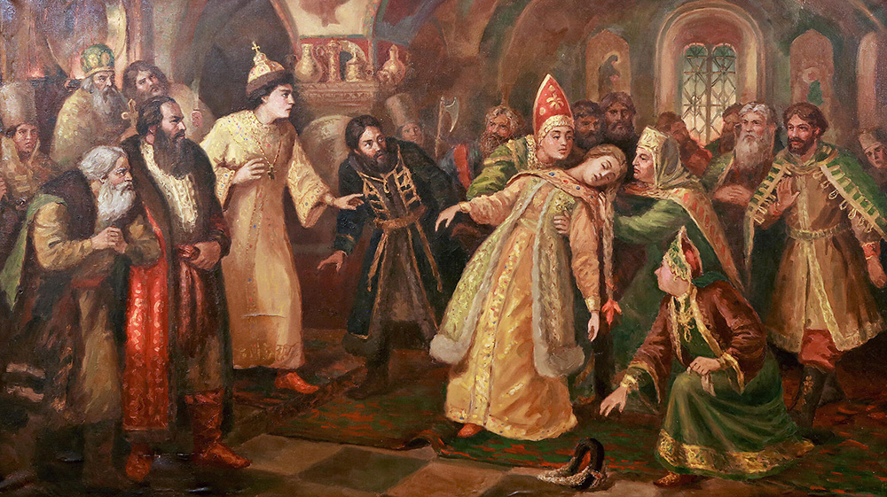 Итак, венчание. В соборной кремлевской церкви жених и невеста становились близ алтаря на соболя, застланные камками (так называли шелковую узорчатую ткань), и начинался священный акт венчания, по завершении которого молодые пили вино из одного сосуда и целовались. Отныне они соединялись «вечно-навечно» самим Богом и обретали новый государственнозначимый статус. Новобрачный царь проходит как бы повторную, после коронации, процедуру утверждения во власти, он отныне воспринимается как «зрелый» правитель, гарантирующий своей женитьбой продолжение династии, а значит, сохранение стабильности России. Ведь ее могущество, в традиционной российской системе ценностей, опиралось на прочность царской власти. Новобрачная в новом статусе царицы (так нарекали ее только после венчания) воспринималась как будущая мать наследника престола, иначе говоря, хранительница династии.