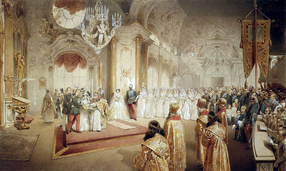 Наконец, после всех предварительных этапов, наступала кульминация свадебного торжества – венчание. Перенос его места при царе Алексее Михайловиче из домовой церкви русских царей, Благовещенского собора, в Успенский кафедральный говорил о том, что изменились представления о брачном венчании царей. Все, что было важно для государства в царской свадьбе, воплощал уже не весь «свадебный чин», а лишь акт церковного венчания. Именно при Алексее Михайловиче его значение неизмеримо возросло, почему и место венчания было перенесено в собор, предназначаемый для событий государственной важности (а старинный свадебный «чин» постепенно отошел в прошлое).