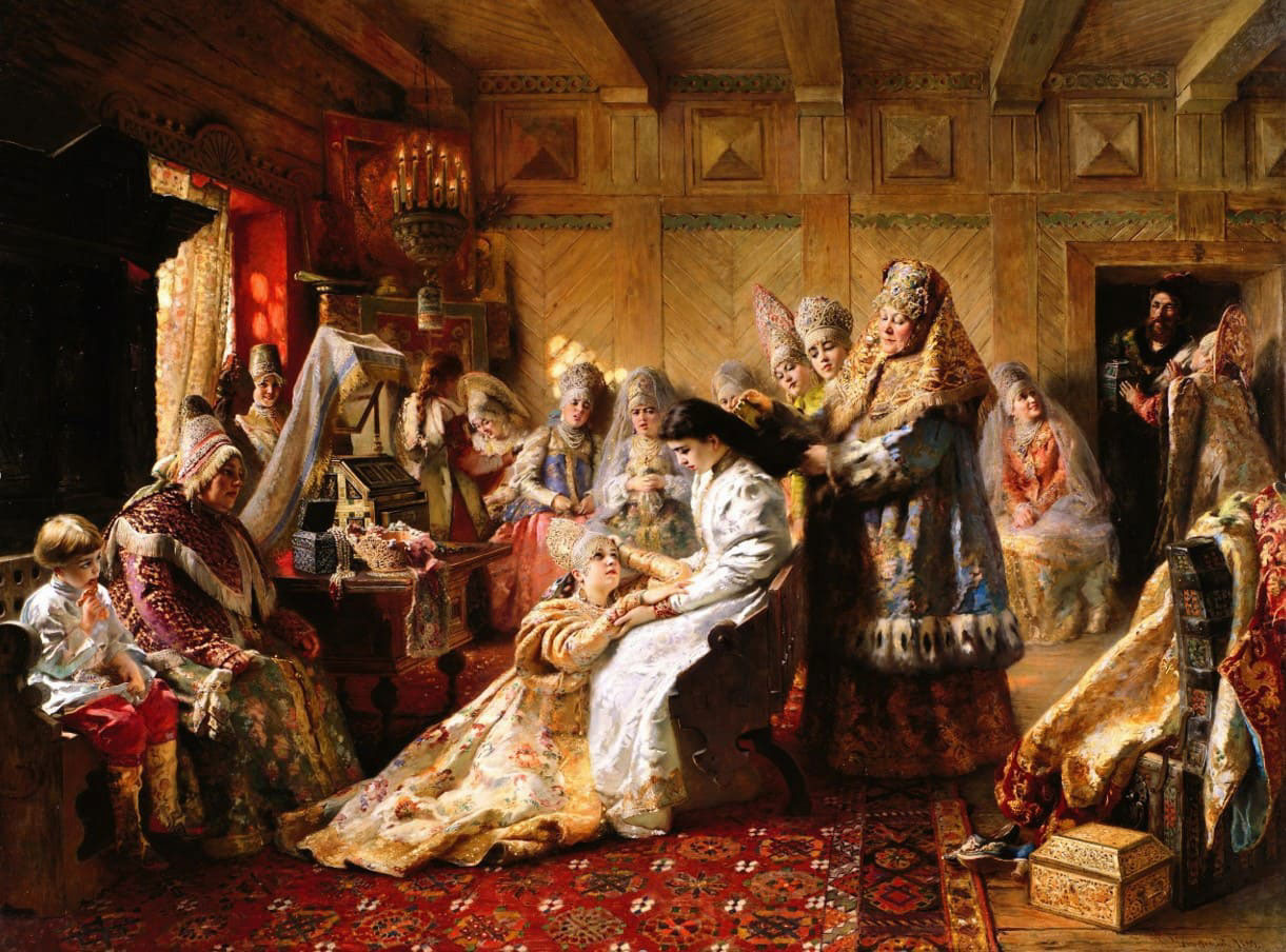Сидячие боярыни – придворные, чья роль на свадьбе сводилась к почетному сидению в Грановитой палате за свадебным столом. Постельники, постельницы – придворные свадебные чины, охранявшие брачную спальню.